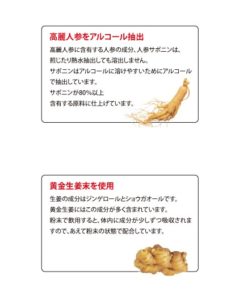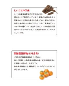 アガリクス、松葉、柿葉、枇杷葉を酵素分解したエキスに、ヒハツ、酢酸菌発酵物(LPS含有)、高麗人参エキス、黄金生姜末を配合しています。
